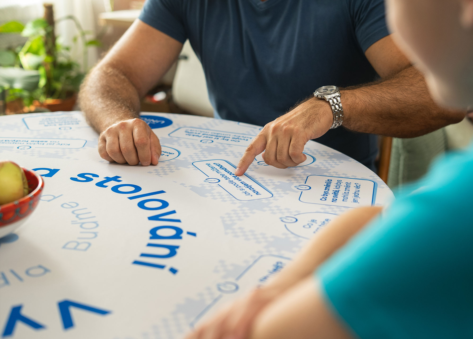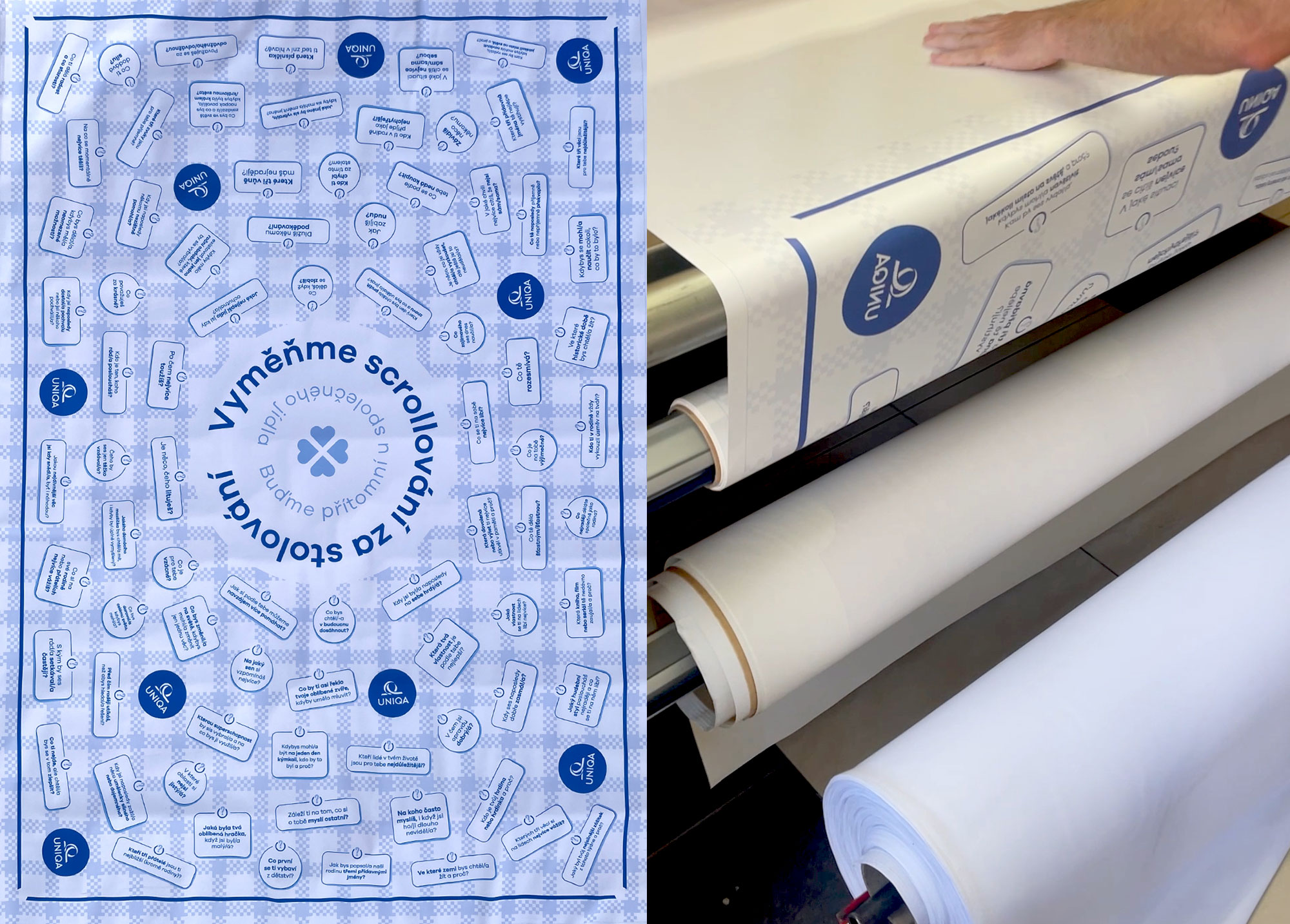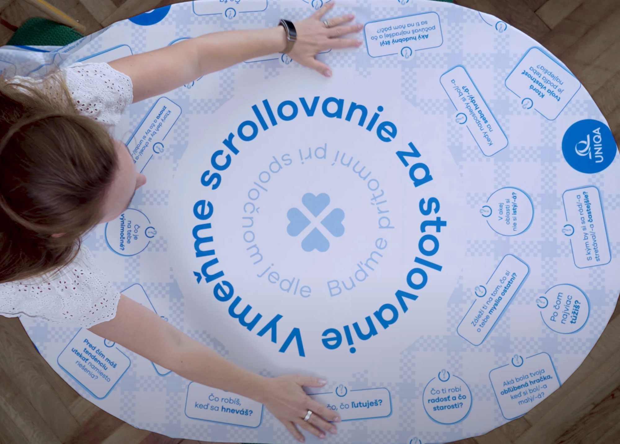Vymeňme scrollovanie za stolovanie! Náš konverzačný obrus ako základný prvok kampane UNIQA: Buďme prítomní. Od vzorkovania po samotnú realizáciu sme produkčne zastrešili finálny výrobok v spolupráci s agentúrou Mannschaft.